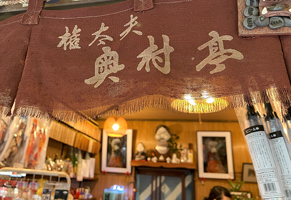 晴れのお参りではのれん越しに降りそそぐやわらかな日差しと荒神峰から優しく流れてくるそよ風。雨のお参りでは権太夫さんの拝殿に続く石段を濡らす雨の香りとかすかな光の反射。記憶の奥深くに残るどこか懐かしい風景と清らかな氣が溢れる空間にいつでも出逢える奥村亭。店主で守役の奥村さんと交わす何気ない会話と相まってずっと座っていたくなる。しばし時間が止まったような心地よい空間で店先を眺めていると、そんな場所が今あることに深く感謝している自分にふと気づきます。