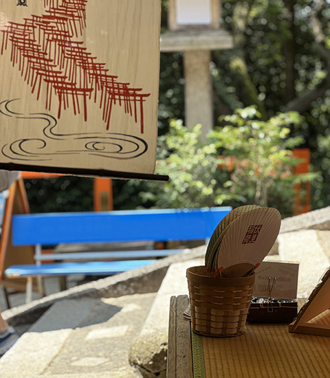 晴れのお参りではのれん越しに降りそそぐやわらかな日差しと荒神峰から優しく流れてくるそよ風。雨のお参りでは権太夫さんの拝殿に続く石段を濡らす雨の香りとかすかな光の反射。記憶の奥深くに残るどこか懐かしい風景と清らかな氣が溢れる空間にいつでも出逢える奥村亭。店主で守役の奥村さんと交わす何気ない会話と相まってずっと座っていたくなる。しばし時間が止まったような心地よい空間で店先を眺めていると、そんな場所が今あることに深く感謝している自分にふと気づきます。