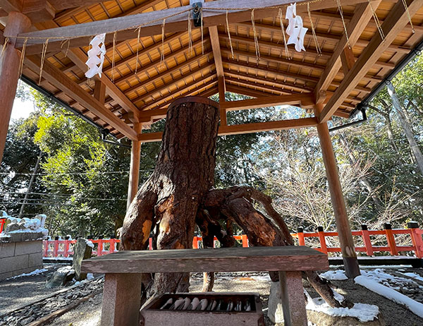 千本鳥居の緩やかな勾配をまっすぐ進んでいくと「奥の院」と呼ばれる「奥社奉拝所」。奥の院の境内左側の鳥居から稲荷山の参道を進みます。少し行った左側に「根上松さま」が鎮座されています。